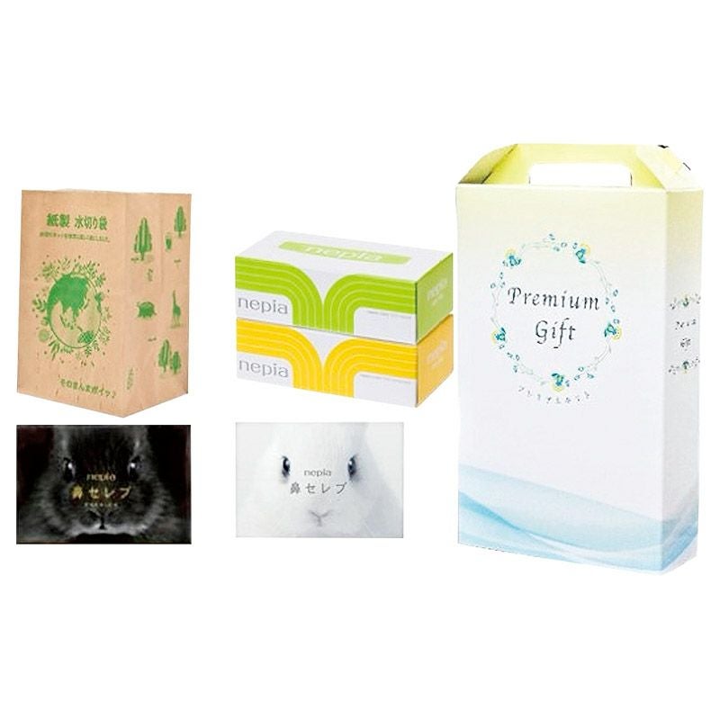 鼻セレブポケットティッシュ(12W)・鼻セレブポケットプレミアムティッシュ(8W)・紙製水切り袋×各1、ネピアミニティッシュ(20W)×2