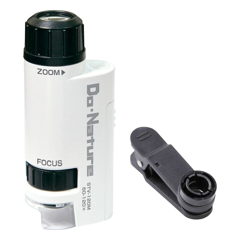 スマートフォンを取り付けて撮影可能なハンディ型顕微鏡。スマートフォンなしでもハンディ顕微鏡として使用できます。倍率も60~120倍のズーム式。LEDライトを内蔵していますので対象物を明るく見やすくします。