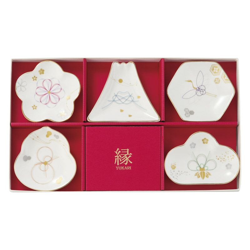 小皿(桜)(約104×104×18mm)・小皿(富士山)(約99×116×18mm)・小皿(鶴)(約110×110×18mm)・小皿(瓢箪)(約105×98×18mm)・小皿(松竹梅)(約85×120×18mm)×各1