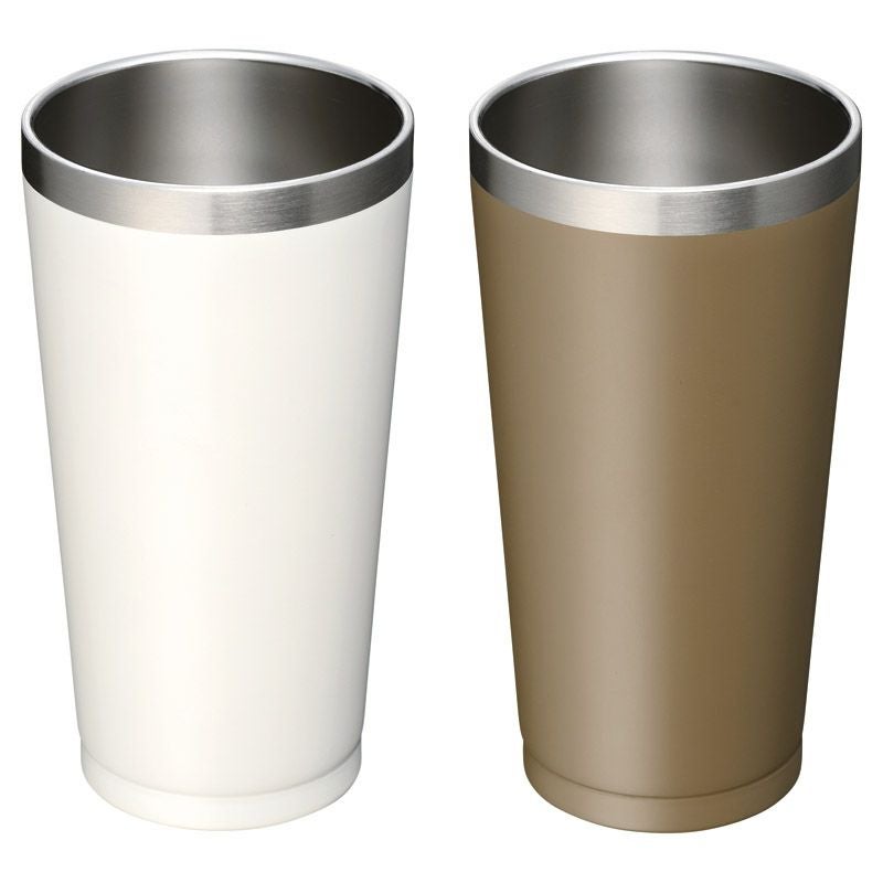 落ち着いたマットなホワイト&ブラウンのペアタンブラーです。外側は熱くなりにくく、氷を入れても結露しにくいステンレス製真空断熱二重構造なので、場所や季節を問わず使えます。