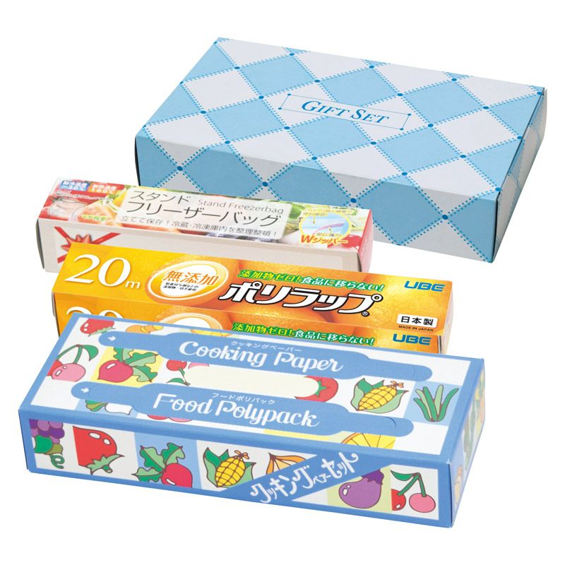 ポリラップ(22cm×20m)・クッキングペアーセット(ポリ袋・キッチンペーパー各10枚)・スタンドフリーザーバッグ(5枚入)×各1