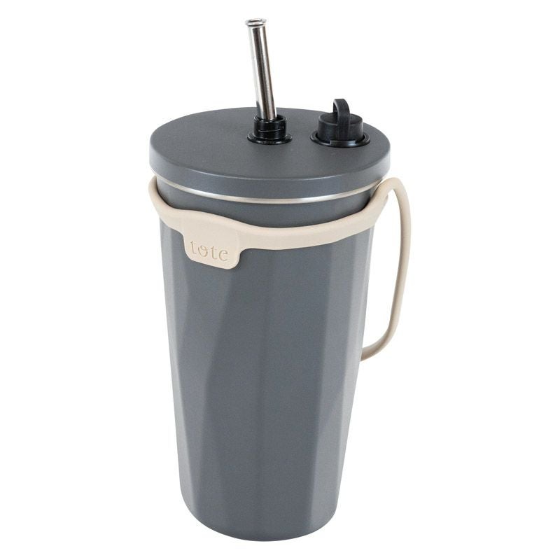 伸縮するストローつきの保温保冷ができるステンレスマグボトル。持ち運びに便利なシリコーン製ストラップ付。ストロー部分のキャップは蓋に置き場所があるのでなくしにくいです。