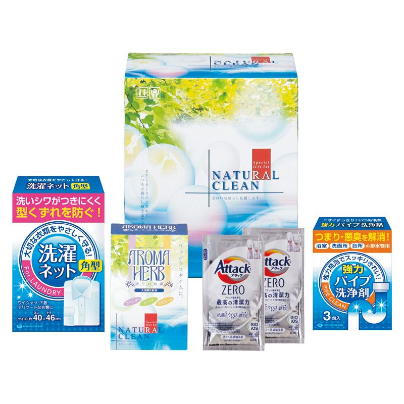 花王アタックZEROワンパック(10g×2袋入)・洗濯ネット角型(約460mm×400mm)・パイプ洗浄剤(3包入)・ハーブエキス配合入浴料(30g×3包入)×各1