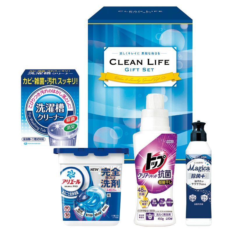 P&Gアリエールジェルボール(11個)・ライオントップクリアリキッド抗菌(450g)・ライオンチャーミーマジカ除菌+(220ml)・洗濯槽クリーナー(50g×2包)×各1