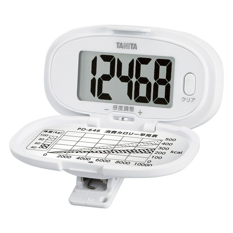 歩数のみを測定するシンプルな仕様。大きく見やすい表示・感度調節機能付き・最大歩数:99999歩、最少1歩。