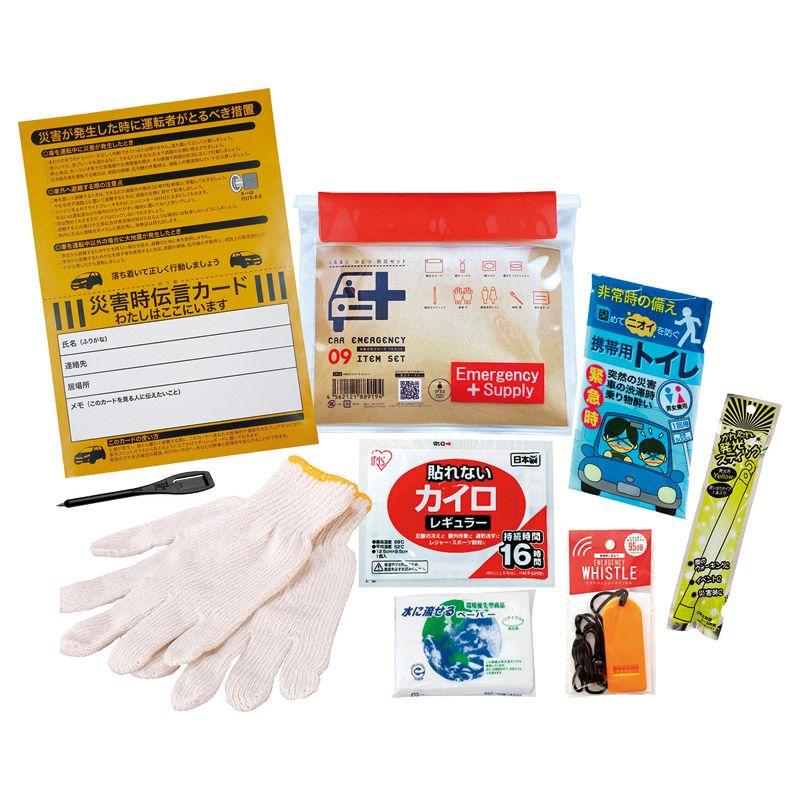 車にひとつ、防災セットをコンセプトにした車のグローブボックスやサイドポケットに保管しやすいポーチ入防災セット。防水規格IPX4適合。