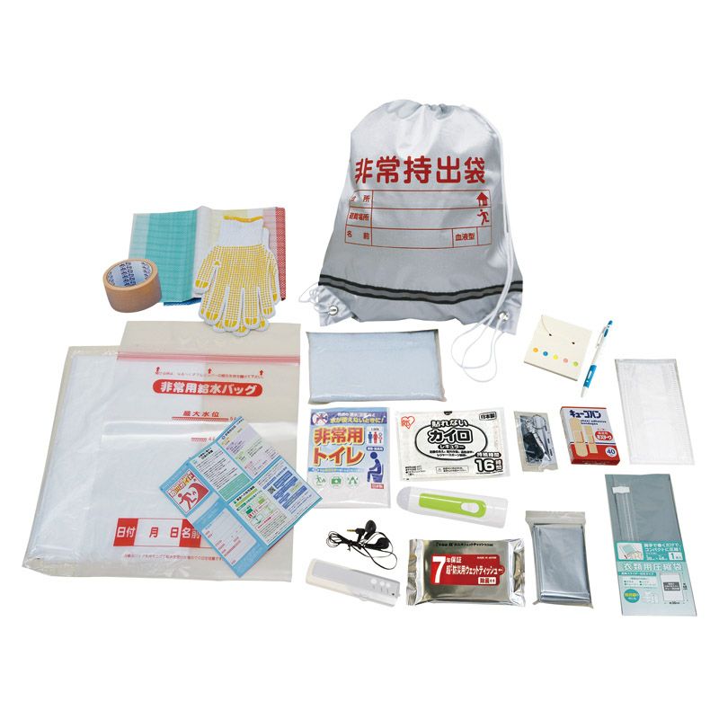 非常袋(反射テープ付)(約440×380mm)×1、非常用給水バッグ(5L)・ハンディライト・防災用ウエットティッシュ(20枚)・コンパクトFMラジオ・すべり止め手袋・防寒シート・救急絆創膏(2サイズ40枚入)・カイロ・マスク・非常用トイレ・緊急用ホイッスル・ゴミ袋(45L10枚入)・タオル・レジャーシート・布テープ・圧縮袋・ボールペン・ふせんメモセット・防災ガイド×各1