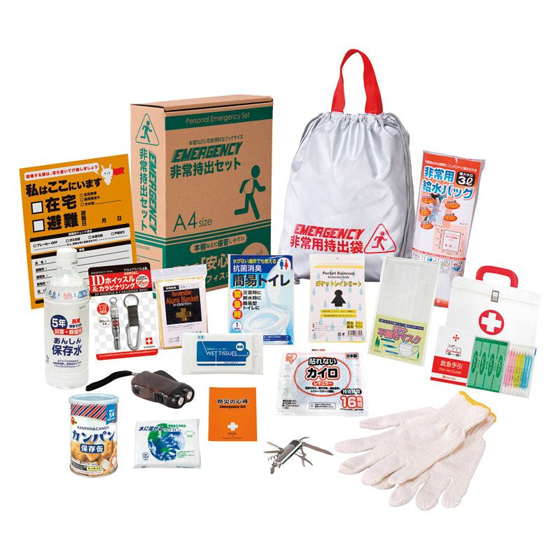 非常持出袋(約340×390mm)×1、防災の心得・IDホイッスル&カラビナリング・カイロ・レインコート・抗菌消臭簡易トイレ・ダイナモLEDライト・8徳ナイフ・軍手・アルミブランケット・マスク・除菌アルコールウェットティッシュ・5年保存水(約500ml)・給水袋(3L)・緊急避難カード・水に流せるペーパー・救急4点セット・カンパン×各1