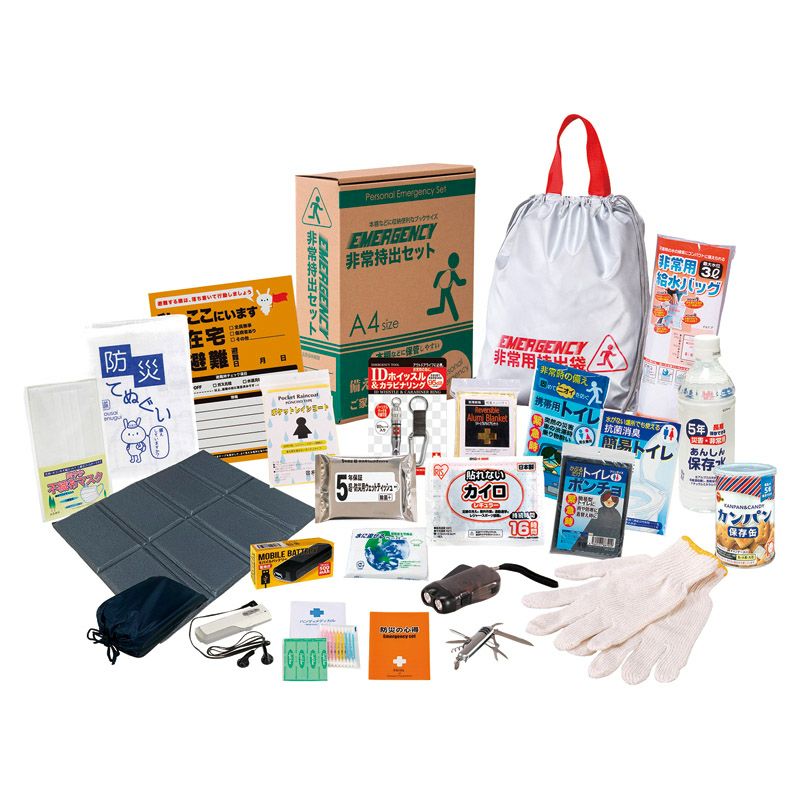 非常持出袋(約340×390mm)×1、防災の心得・IDホイッスル&カラビナリング・カイロ・レインコート・携帯用トイレ・抗菌消臭簡易トイレ・トイレポンチョ・ダイナモLEDライト・モバイルバッテリー(乾電池式)・FMラジオ・軍手・アルミブランケット・防災てぬぐい・マスク・ウェットティッシュ・クッションシート・5年保存水(約500ml)・カンパン・8徳ナイフ・給水袋(3L)・緊急避難カード・水に流せるペーパー・綿棒&絆創膏×各1
