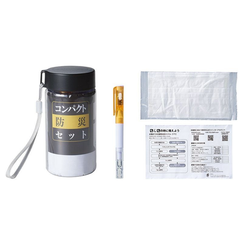 防災ボトル(約420ml)・ホイッスル付きライトペン(色指定不可)・個包装マスク・防災台紙・ストラップ×各1