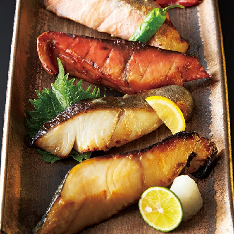 本鰆西京漬(80g)×2、銀だら粕漬け(80g)・カジキみそ漬(80g)・まぐろみりん漬(80g)・まぐろハラモみりん漬(80g)×各1