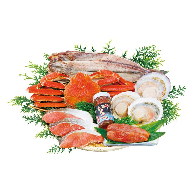 ずわいがに(350g)・ほっけ・北海道産辛子明太子(100g)・いくら醤油漬け(60g)×各1、ほたて片貝M・紅鮭×各3