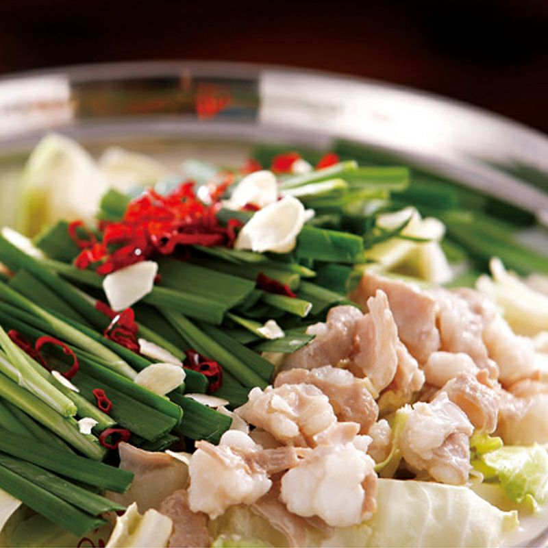 博多を代表する名物のコラボ、とんこつ味のもつ鍋 国内産牛もつを使用。『しめ』のちゃんぽんもついた最後まで楽しめるセットです。キャベツやニラなど野菜をたっぷり入れてお召し上がりください。