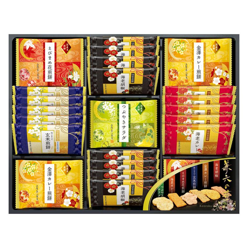 金澤カレー煎餅・えびまめ花煎餅・海老胡椒煎餅×各8、黒ごま入り玄米煎餅・海老カレー煎餅×5、つぶやきサラダ煎餅×4