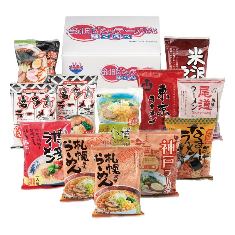 北海道札幌ラーメン味噌味(約117g)・喜多方ラーメン醤油味(約116g)×各2、博多ラーメン豚骨味(約112g)・北海道小樽ラーメンしお味(約112g)・秋田なまはげラーメン比内地鶏醤油味(約112g)・米沢ラーメン醤油味(約110g)・東京ラーメン醤油味(約113g)・和歌山ラーメン豚骨醤油味(約117g)・神戸ラーメン醤油味(約117g)・尾道ラーメン醤油味(約116g)×各1 ■アレルギー:小麦・えび・かに