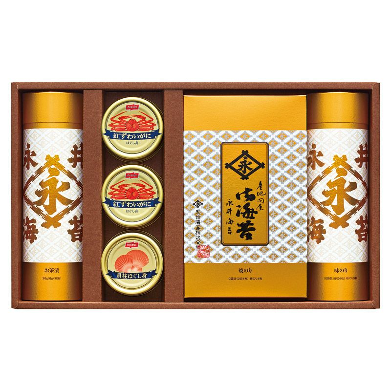 焼のり(2切4枚2袋)・味のり(8切4枚10袋)・のり茶漬(6袋)・貝柱ほぐし身×各1、カニ缶×2 ■アレルギー:小麦・えび・かに