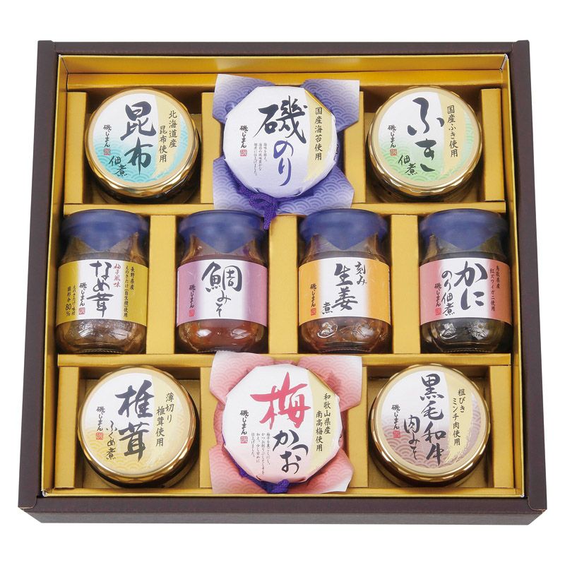 昆布佃煮(70g)・磯のり(90g)・ふき佃煮(50g)・椎茸ふくめ煮(85g)・梅かつお(90g)・黒毛和牛肉みそ(90g)・柚子風味なめ茸(85g)・鯛みそ(100g)・刻み生姜煮(90g)・かにのり佃煮(90g)×各1