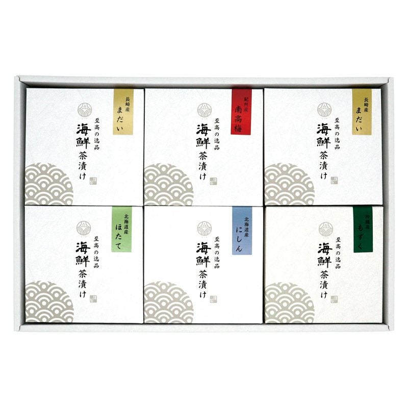 長崎県産まだい水煮×2、北海道産ほたて水煮・北海道産にしん甘露煮・紀州南高梅・沖縄県産もずく×各1、だしつゆ・茶漬け薬味×各6